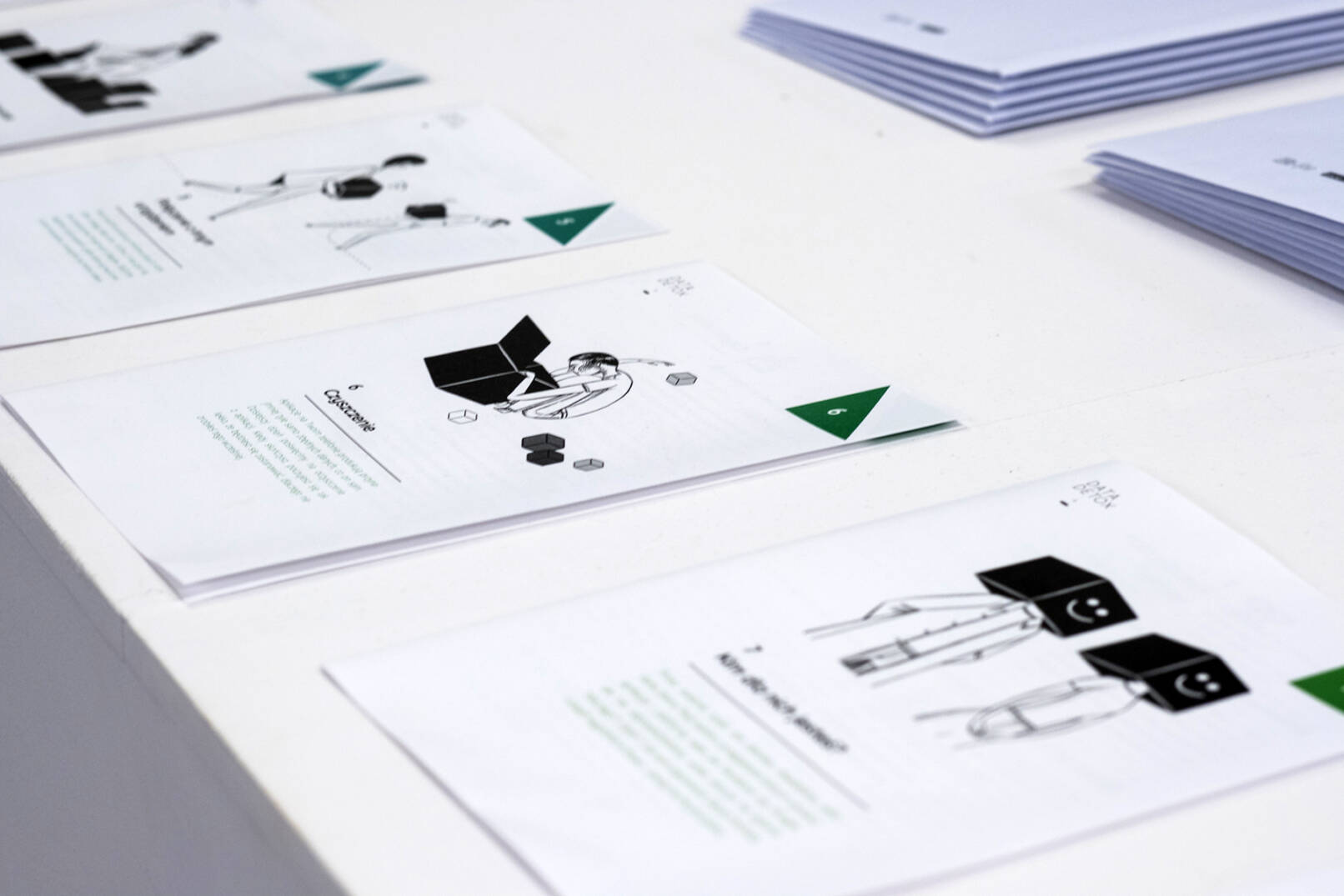 La Loma hat das Data Detox Kit in Zusammenarbeit mit zwei Illustrator:innen in zwei einladenden Varianten entworfen. Die Edition in DIN-A5-Format für die Glass Room Community Edition stand als Download zur Verfügung. Sie konnte in kleinerer Auflage kostengünstig produziert und verteilt werden. Besucher:innen der Glass-Room-Ausstellungen erhielten an der Data Detox Bar die aufwendigere Version des Kits in einer Faltschachtel. Übersichtlich und klar gestaltet führen die Ratgeber zu den einzelnen Themen niederschwellig durch die Schritte zur digitalen Entgiftung – ohne technisches Vorwissen vorauszusetzen.
